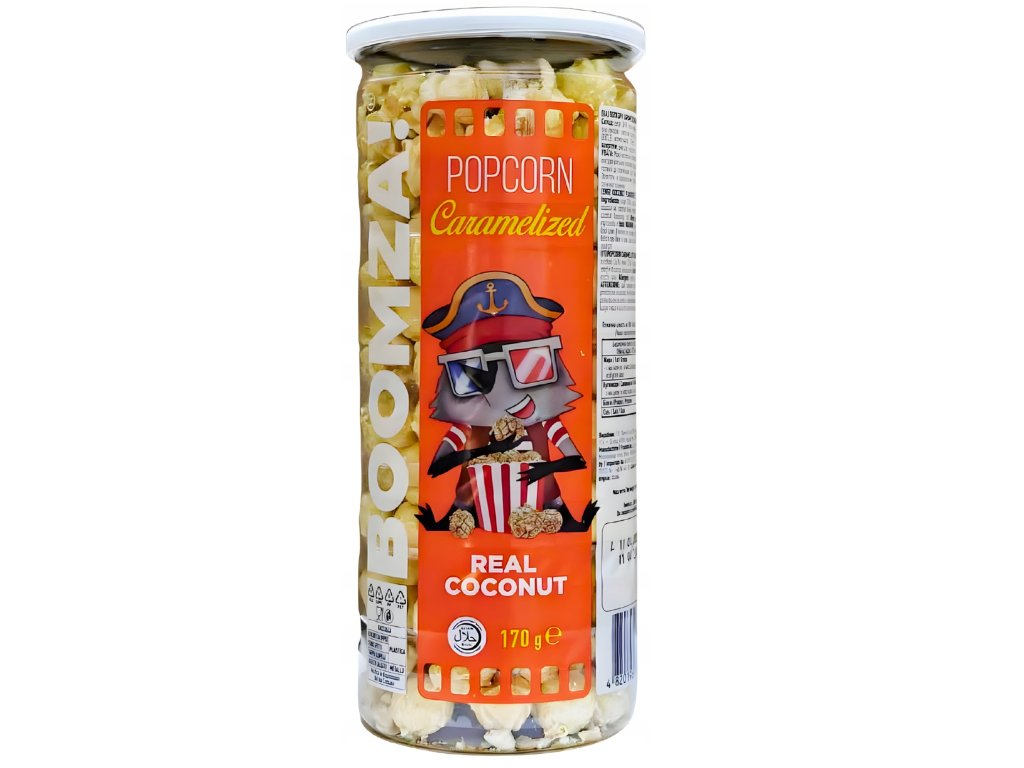 Složení: cukr (36 %), kukuřičná zrna (27 %), glukózový sirup, kokosový olej, kokosové vločky, emulgátor (sójový lecitin (E3221)), kokosové aroma, sůl. Alergeny: sója. UPOZORNĚNÍ: Může obsahovat nepražená zrna. Pokud jsou zrna slepená, nechte je vychladnout. Výrobek je připraven k okamžité spotřebě.