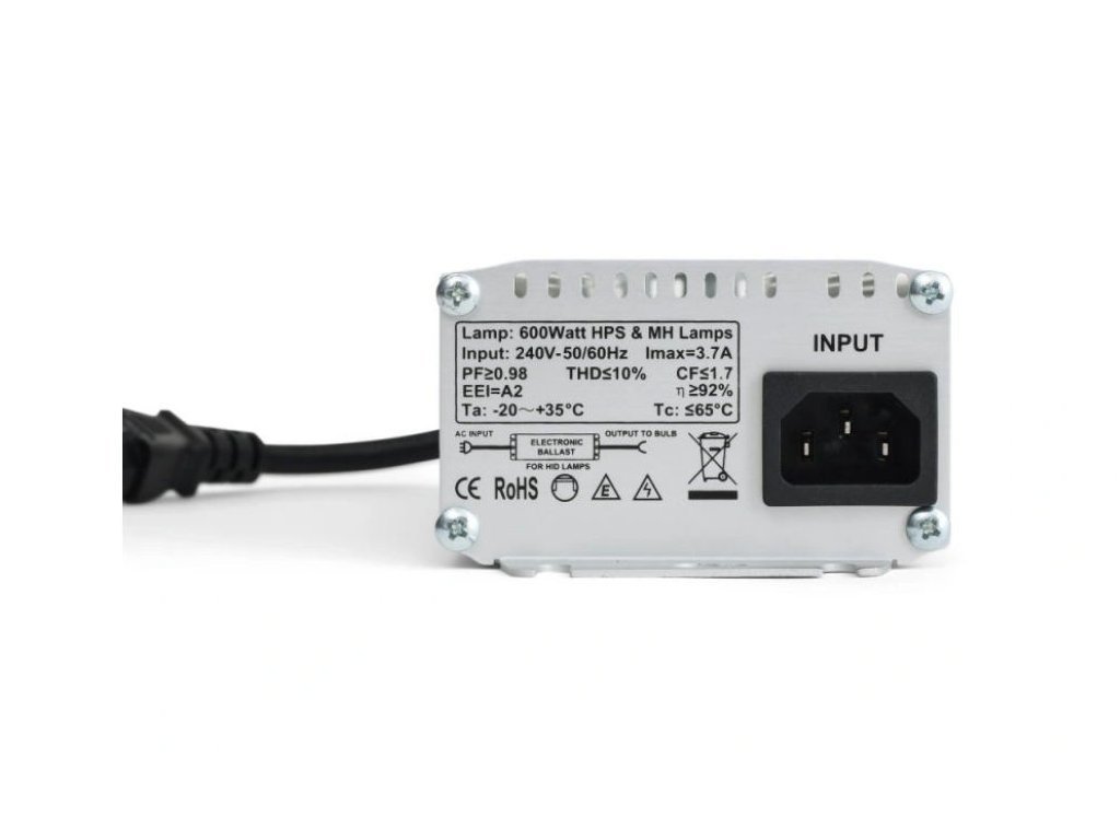 Eletronick přepínatelný předřadník VDL Silver 600w umožňuje zapojení MH i HPS výbojek. Nový vylepšený digitální předřadník kompatibilní s 250, 400 a 600w sodíkovými a MH výbojkami.Předřadník VDL má nové kvalitnější zpracování a vylepšené funkce, jako jsou vyšší účiník, lepší účinnost přeměny energie, urychlený odvod tepla a „Soft Start“ pro zlepšení životnosti lampy. Předřadník neobsahuje žádný ventilátor a proto je zcela tichý.